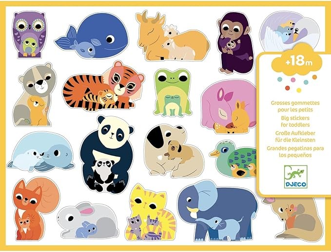 • Mais de 100 adesivos de animais e seus filhotes • Tamanho grande e bordas espessas para fácil manuseio • Ideal para introduzir atividades de colagem • Estimula coordenação motora fina e criatividade • Material seguro e resistente