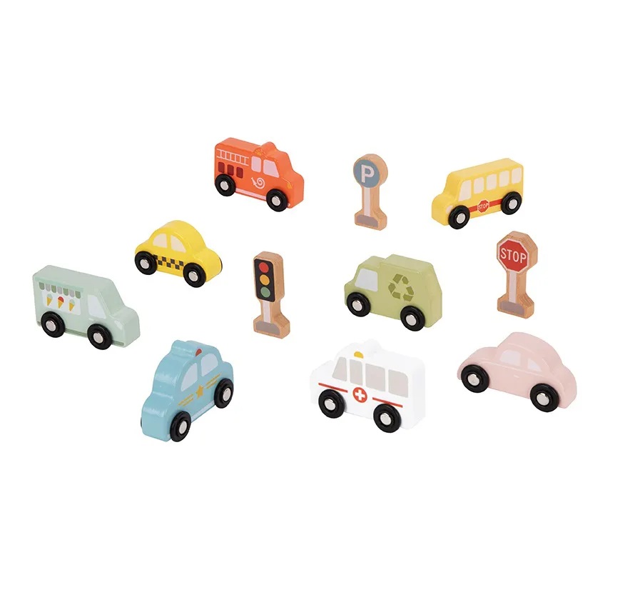Este conjunto irá manter as crianças ocupadas por horas, brincando sozinhas ou com amigos. Vem com 8 veículos de madeira (uma ambulância, carro de polícia, bombeiros, ônibus escolar, caminhão de coleta de lixo, caro de passeio, truck food de sorvetes e táxi), além de 3 placas de trânsito.INMetro: CE-BRI/INNAC 00152-03A.