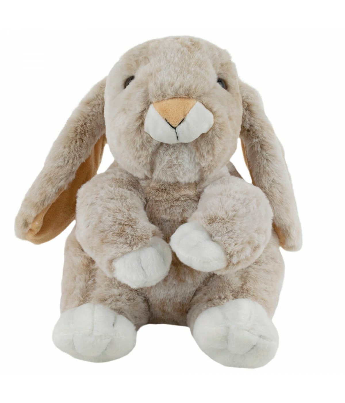 Bichinho de pelúcia no formato de um coelho bege sentado com 26 cm de altura e 22 cm de largura. Olhos de plástico.