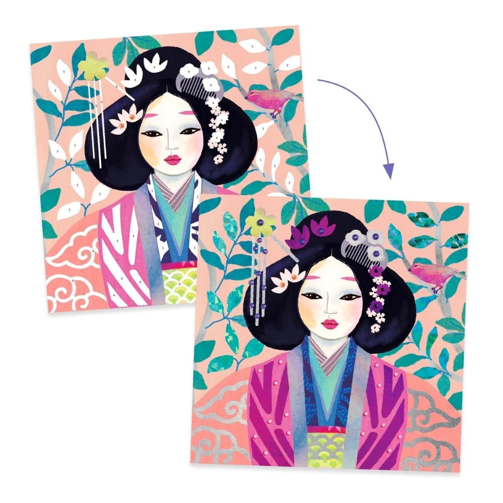 Uma viagem pelo mundo através de quatro retratos femininos marcantes! Com este conjunto criativo, as crianças transformam imagens já adesivadas em obras brilhantes com folhas metalizadas e pedrinhas de strass. Basta remover a película protetora, aplicar a folha colorida e... magia! O brilho adere instantaneamente. Finalize colando os strass para realçar detalhes como colares, brincos e coroas.