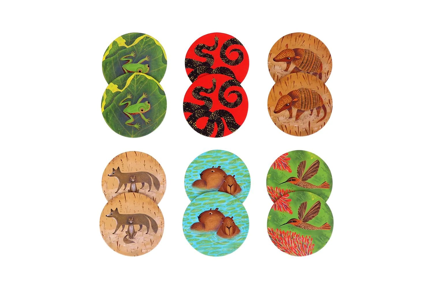 • 28 peças redondas com ilustrações da fauna da Mata Atlântica