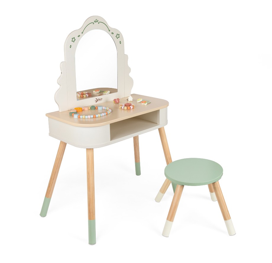 A Penteadeira Mágica é o cantinho perfeito para brincadeiras de autocuidado, imaginação e expressão pessoal. Com espelho decorado, banquinho confortável e acessórios de beleza em madeira, ela convida as crianças a criarem seus próprios rituais de preparação, explorando cores, formas e histórias. O design em tons suaves, combinado com detalhes em estrelas, cria uma atmosfera encantadora que transforma cada momento em uma experiência lúdica, estimulando linguagem, coordenação motora e criatividade.