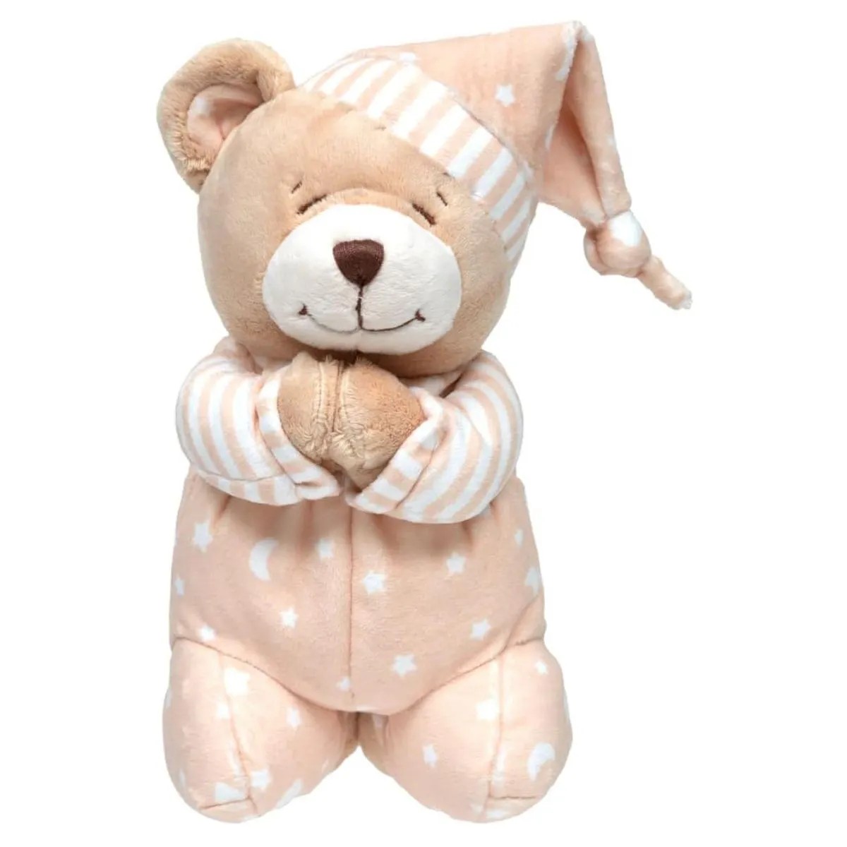 O Ursinho que Reza Bege é um companheiro afetivo que ajuda os pequenos a dormirem tranquilos. Ao apertar a barriguinha, ele recita a oração do Anjo da Guarda com voz suave, promovendo acolhimento e serenidade na rotina de sono.Feito com pelúcia macia e acabamento delicado, é ideal para estimular o vínculo emocional e deixar o quartinho ainda mais charmoso.